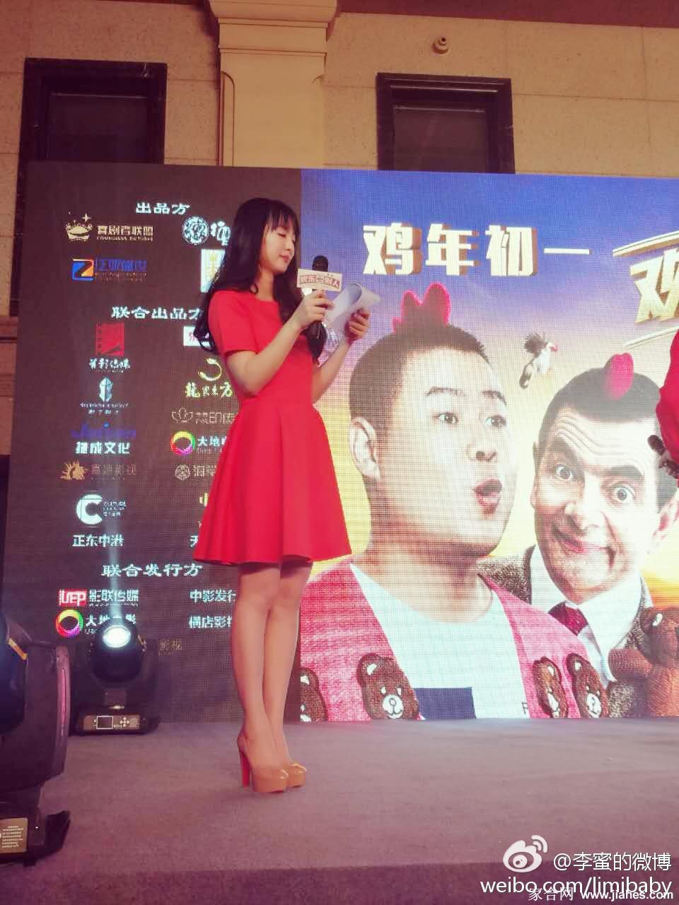 李蜜端坐于高脚凳上,双腿优雅交叠,红色裙摆如花朵般散开,展现其从容不迫的巨星气质