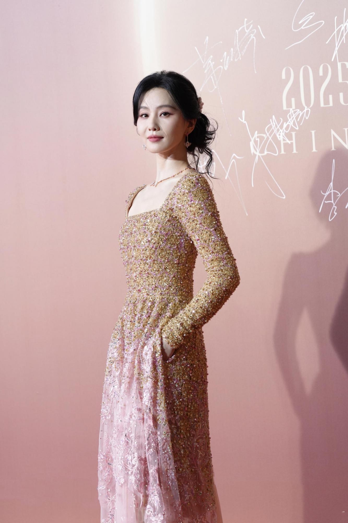 值得一提的是,这组照片的魅力很大程度上源于其“生图”属性。没有影棚里完美的灯光布景,也没有后期过度的肌肤磨皮,图片中皮肤的质感、礼服面料的光泽乃至现场的光影都显得无比真实。这种真实感非但没有折损她的美丽,反而让那份优雅变得更加可触可感。脸颊旁自然散落的几缕发丝,为整体端庄的造型注入了一丝随性与温柔,让人联想到她此前穿裸粉色礼裙时那种“大家闺秀温婉动人”的神韵。