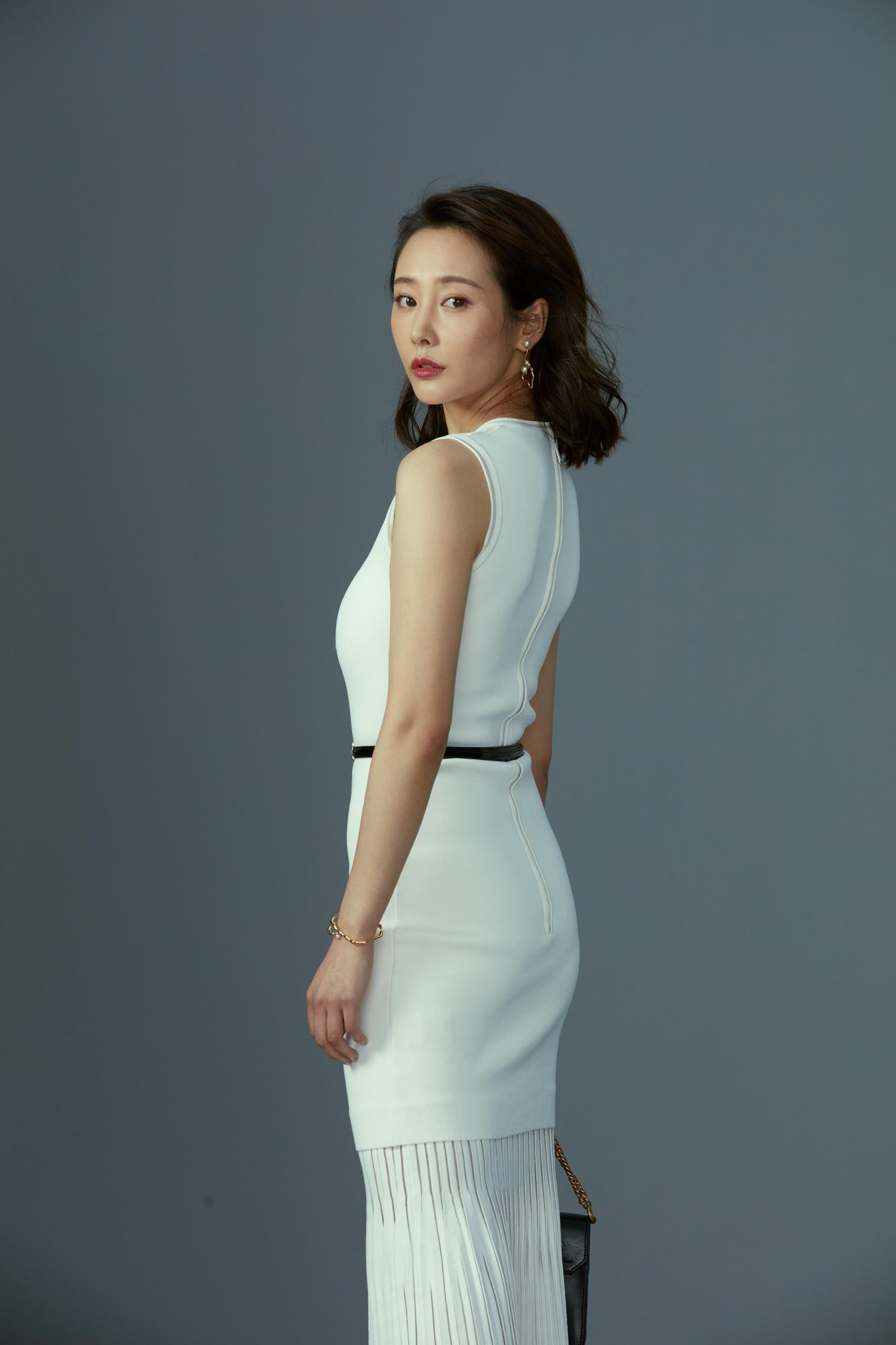 李纯侧身立于光影之中,白色长裙勾勒出流畅的腰臀曲线,微卷长发自然垂落肩侧,眼神宁静望向远方